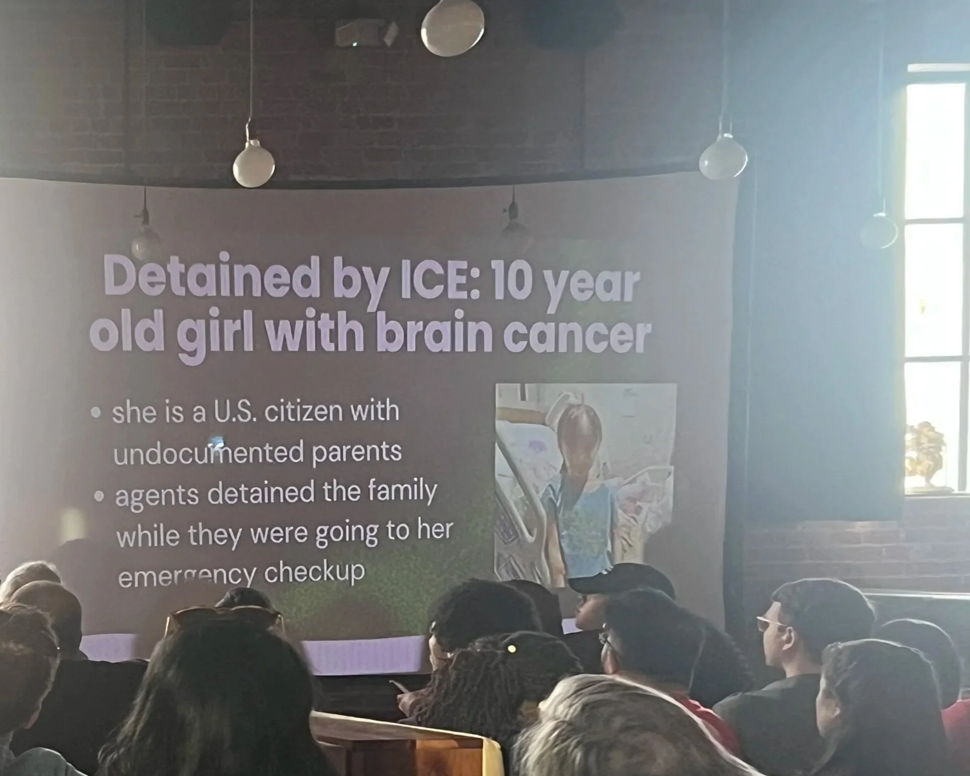 Attendees then heard from Millie, a local immigration paralegal and indigenous Guatemalan. She gave a presentation outlining the constitutional rights that immigrant advocates have, including the freedom of speech, freedom from retaliation, the right to film ICE agents, and the right to remain silent. She also explained what to do if you are arrested as a protester, and other legal considerations for people to stay safe while advocating for the immigrant community, such as keeping a safe distance from ICE operations and not encouraging people to run. Lastly, she talked about what advocates can do when ICE raids target the local community; she mentioned her personal experience with ICE raids in Mississippi that devastated the community.